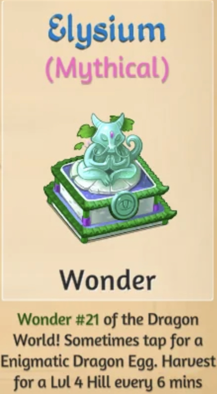 | ā | Wonder #21 of the Dragon World! Sometimes tap for an Enigmatic Dragon Egg. Harvest for a Lvl 4 Hill every 6 mins. | ā |
