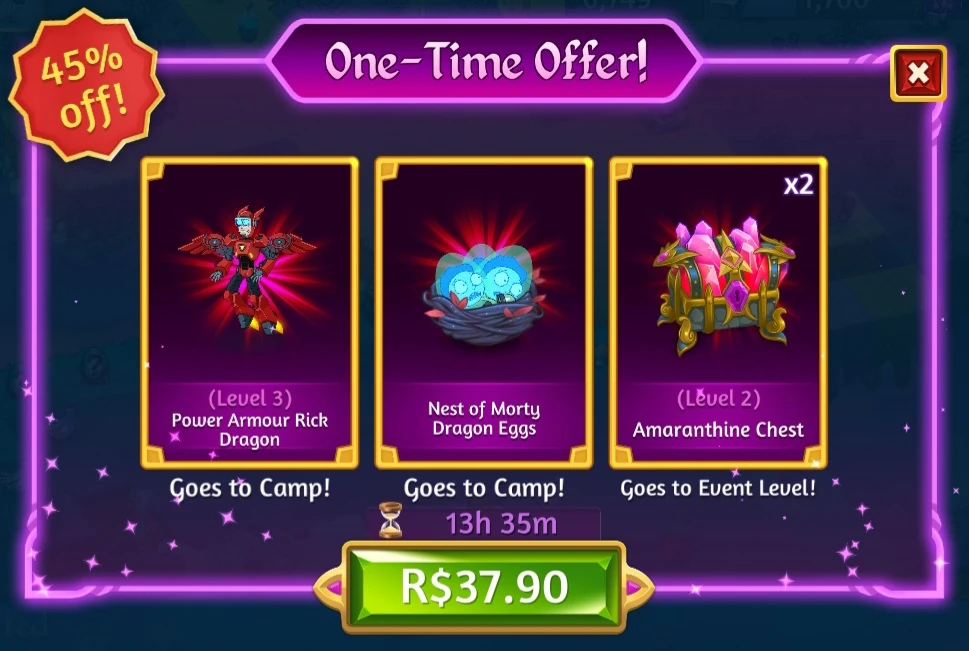 One time offer was presented, which could be accessed from the top right of the screen all the time of the event. For 10$ (in the U.S., the price varied depending on the country of the user), you could get Power Armour Rick Dragon, Nest of Morty Dragon Eggs and 2 Amaranthine Chest.