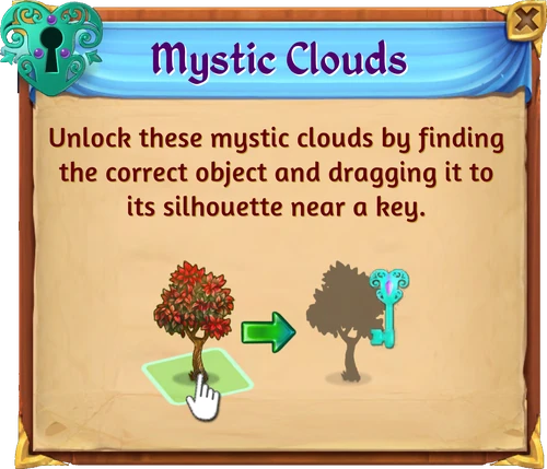 In order to achieve the key and unlock the clouded land, the player needs to find an object that matches the silhouette, and drag it into the silhouette. Once done, a sound identical to removing the evil fog patches in camp will be heard, and the tiles under the clouds would be revealed.