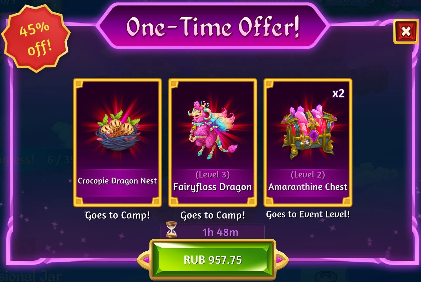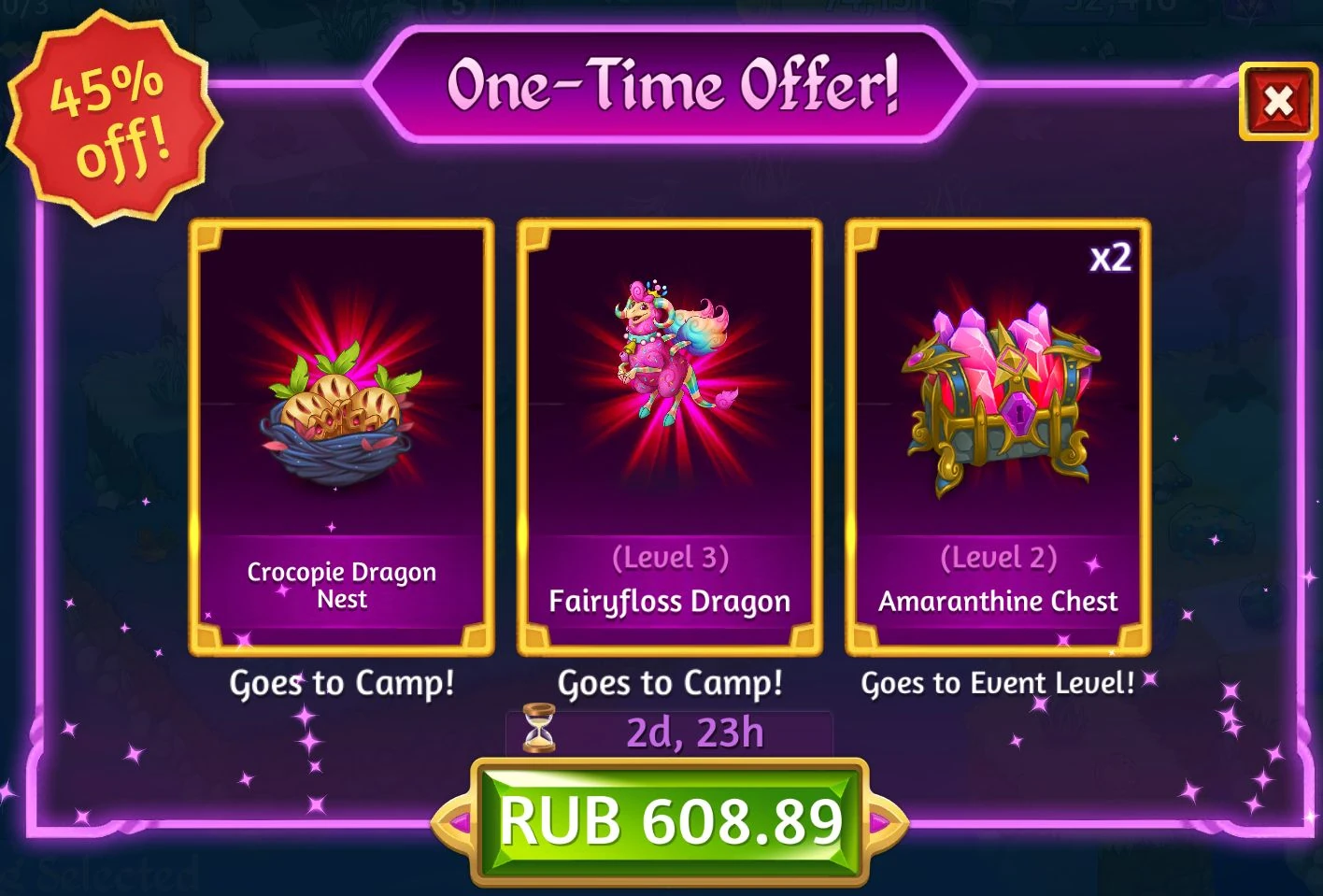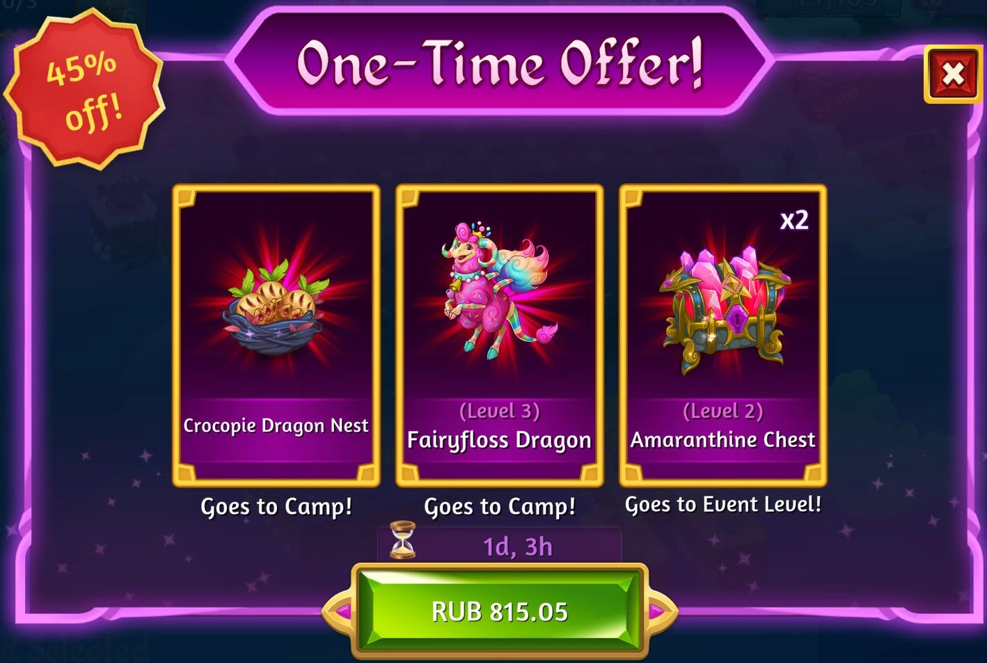For the duration of the Event a one-time offer was available, which could be accessed from the middle right of the screen both in Camp and in Event. For 15$ (in the U.S., the price varied depending on the country of the user) you could get a Nest of Crocopie Dragon Eggs, a level 3 Fairyfloss Dragon and two Amaranthine Chests.