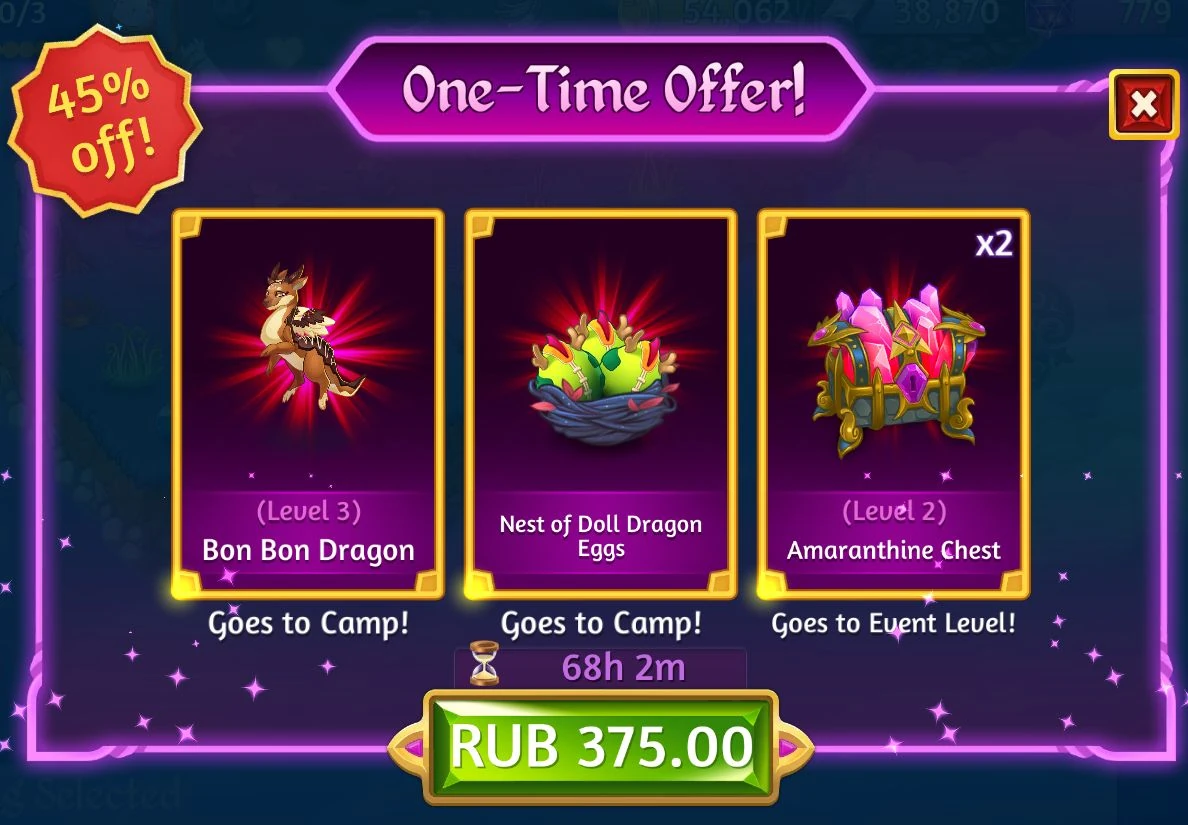 For the duration of the Event a one-time offer was available, which could be accessed from the middle right of the screen both in Camp and in Event. For 15$ (in the U.S., the price varied depending on the country of the user) you could get a level 3 Bon Bon Dragon, a Nest of Doll Dragon Eggs and two Amaranthine Chests.