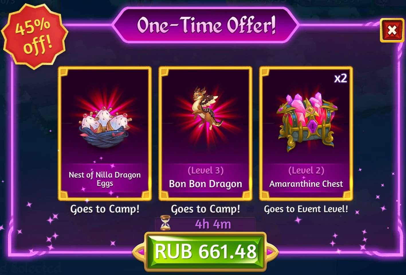 For the duration of the Event a one-time offer was available, which could be accessed from the middle right of the screen both in Camp and in Event. For 15$ (in the U.S., the price varied depending on the country of the user) you could get a Nest of Nilla Dragon Eggs, a level 3 Bon Bon Dragon and two Amaranthine Chests.